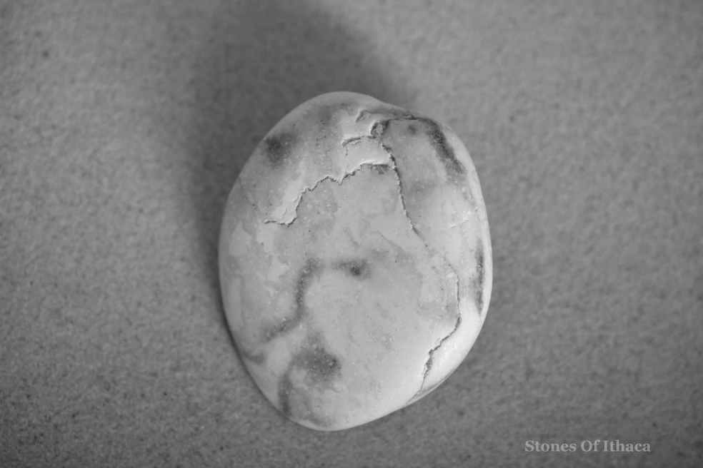 There is a quite remarkable bird perched on the right of this stone, with a thick bill. What impresses me about this stone are the thick, charcoal-like lines. A face looms out of the central part of the stone (again the thick, charcoal lines). To the left is a sea with dotted islands and, above it, another face points upwards, but it is the bird with its thick bill that draws our attention, perched on white, the different parts of the drawing emphasized by meandering cracks in the stone.