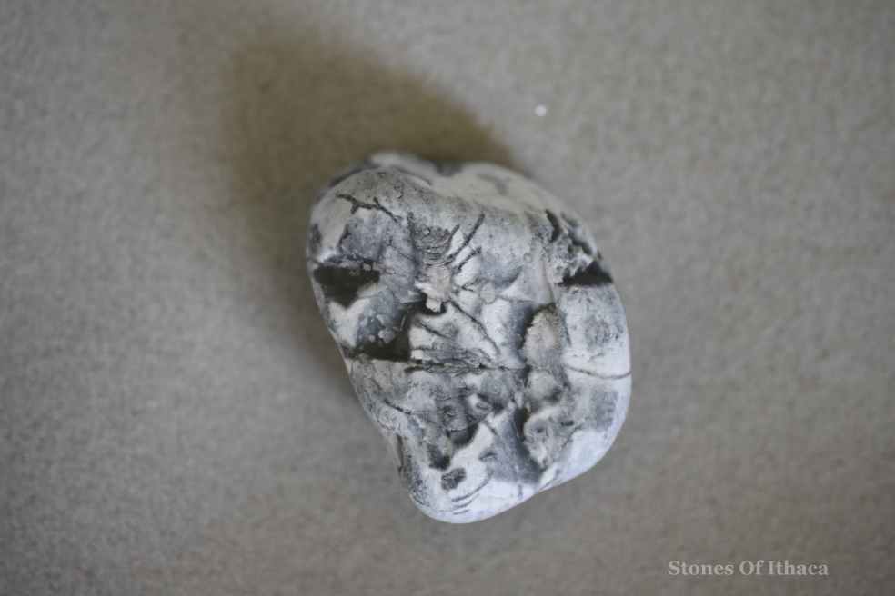In this stone, we see a plethora of creatures. I would go so far as to say that this stone represents day six of Creation, as related in chapter one of the Book of Genesis, which is when God created the land animals – cattle, creepy-crawlies, beasts of every kind (domestic and wild animals and insects) – together with man. In the middle of the upper half of this stone is a creepy-crawly, a spider perhaps, its legs outstretched as when it balances on its web. Indeed, slung across the paths of Ithaca are numerous fat spiders waiting on their webs. But there are the faces of other animals, also – I see a happy dog, laughing and playful, barking to receive a ball; a dinosaur looms out of the primitive forest, gone but not forgotten; and there is the figure of a seated child with its shadow, that insubstantial form that follows us about and sometimes takes our attention.