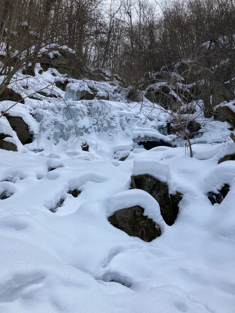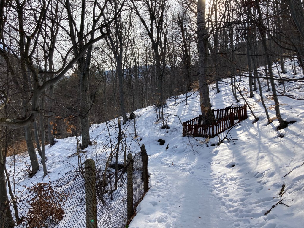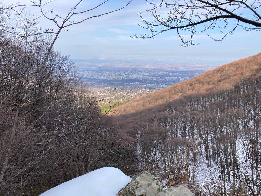 At a later stage, you will come across a fountain with a bench and a small icon of the Mother of God. All the time, paths continue up the mountain or drop down, but there is no need to change your height. After about an hour, there is a rocky outcrop with one of the most beautiful views of Sofia down below. Be careful not to go too close to the edge! This is an ideal place to stop and take some refreshments. You are now two minutes away from the waterfall. Continue along the path, and you will come to the waterfall, which when I visited in February was partially frozen and made for a wonderful sight.