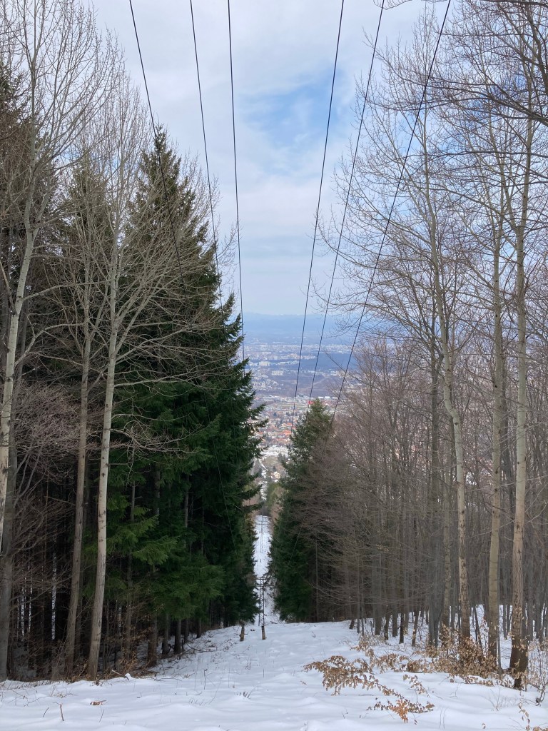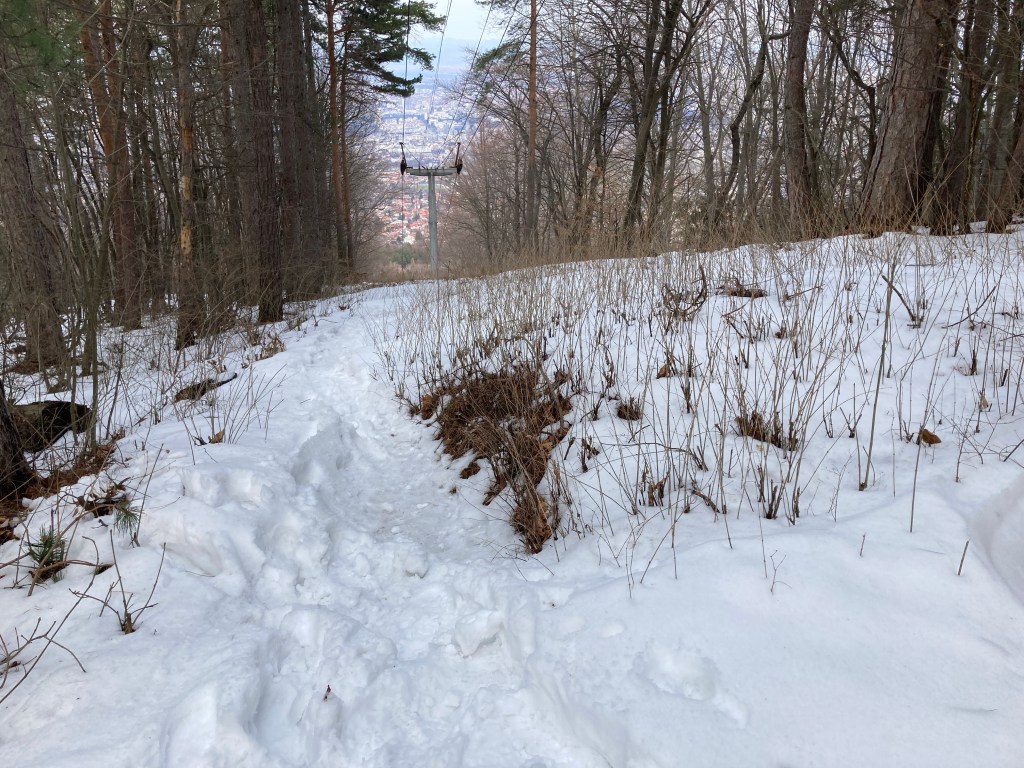Continue at the same height. The path winds through a wonderful beech and pine forest. After a short time, you reach the disused Dragalevtsi-Goli Vrah chairlift, my first experience of taking a lift on Vitosha Mountain. It was like sitting on a park bench suspended in mid-air and for me, a novice at the time, it was a terrifying experience. I gradually became used to it, but sadly the lift has been discontinued. This is a shame since it offered a very useful way for walkers and mountain bikers to head up the mountain.
