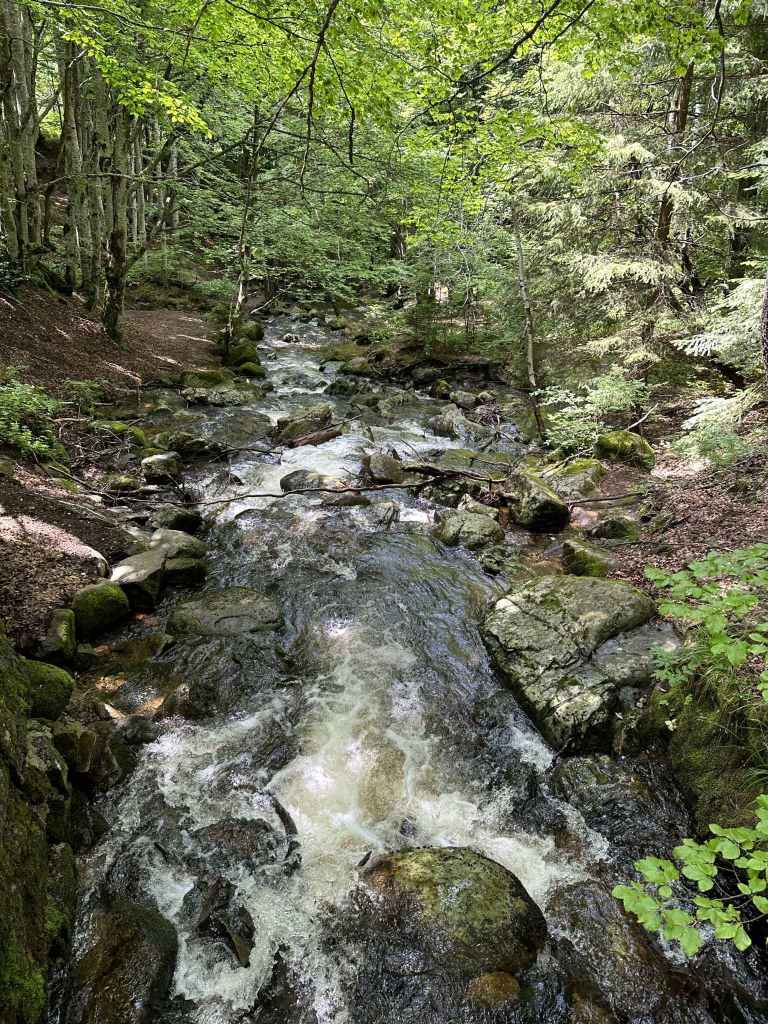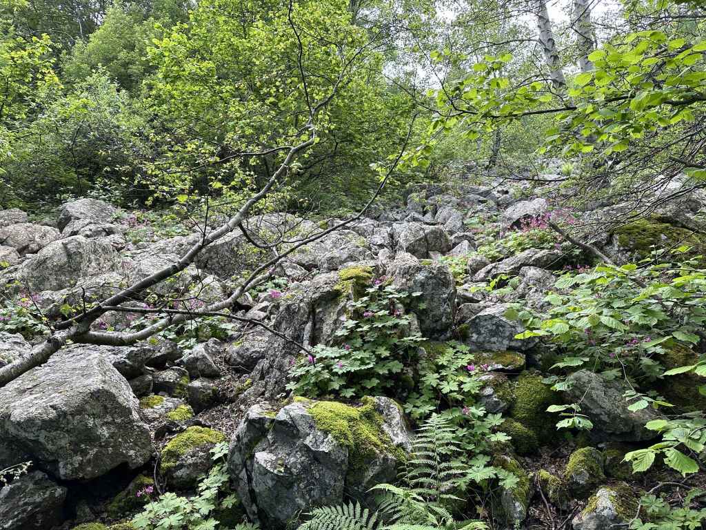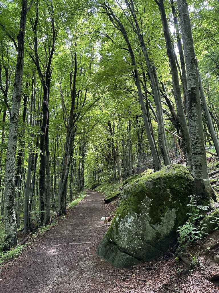 What makes this walk so special is the sudden transition from the world of concrete (the hotel) to the world of nature. You are literally immersed. The path starts on the right of the hotel. It immediately divides, a branch on the left heading back down to Boyana. Ignore this branch and continue up some steps, past a marble bench, into a wonderful avenue of trees that lean towards each other in the canopy, forming what looks like the nave of a cathedral. Large boulders are strewn on the right, resembling strange creatures. After approximately ten minutes, a path diverges on your left to Boyana Waterfall. This is the path you will return on. Ignore it for now and continue straight in the direction of Cherni Vrah/Momina Skala. After ten minutes, you will come to a crossroads. You want to go left here, still in the direction of Cherni Vrah/Momina Skala, but I’m going to let you in on a secret. A few metres away is my favourite spot on the mountain, a magical place I walked past for many years without knowing it was there. To get there, you need to make a small detour: at the crossroads, turn right towards Karpuzov Valog. Continue for a couple of minutes past some trees on your left until you reach a picnic table out in the open. Leave the path and walk to the picnic table. From here, you have the most outstanding view of south-west Bulgaria. My wife and I watched the sunset here one New Year’s Eve. It is such a peaceful place for a moment of mindfulness.