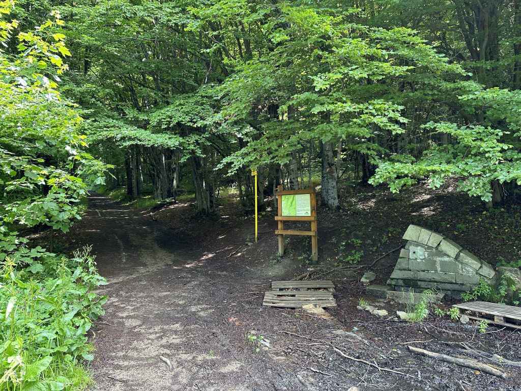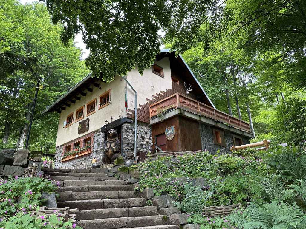 A path on your right goes uphill to Cherni Vrah. It is possible to reach the last of the mountain huts on this walk, Kikish, more directly by taking this path and then a left fork that goes to Kikish via Sredets, but we are going to take the path on the left that goes downhill and is signposted for all three mountain huts and Boyana Waterfall. In five minutes, the path divides. Go right, again in the direction of the three huts. After five minutes, a path joins from the left. This is the path you will go back on, but keep going downhill and in five minutes you will reach the first of the huts, Esperanto. It is currently abandoned and a little overgrown. There is a swing attached to a tree.