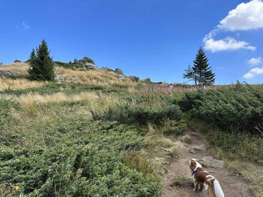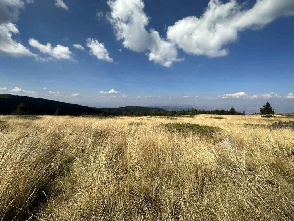 This walkway takes you into a forest. Follow the path through the forest for about twenty minutes. You will cross numerous streams coming down the mountain and pass a moraine field on the right. On leaving the forest, there are rocks on your left, and then a wonderful view towards the summit, Cherni Vrah, opens up on your right. I suggest leaving the path at this point, once you are out in the open, and climbing one of the rocks on the left. People stop here to have a picnic and to enjoy the amazing views north-west from here. You cannot see Sofia (that is hidden by the mountain), but you can just make out the TV tower at Kopitoto.