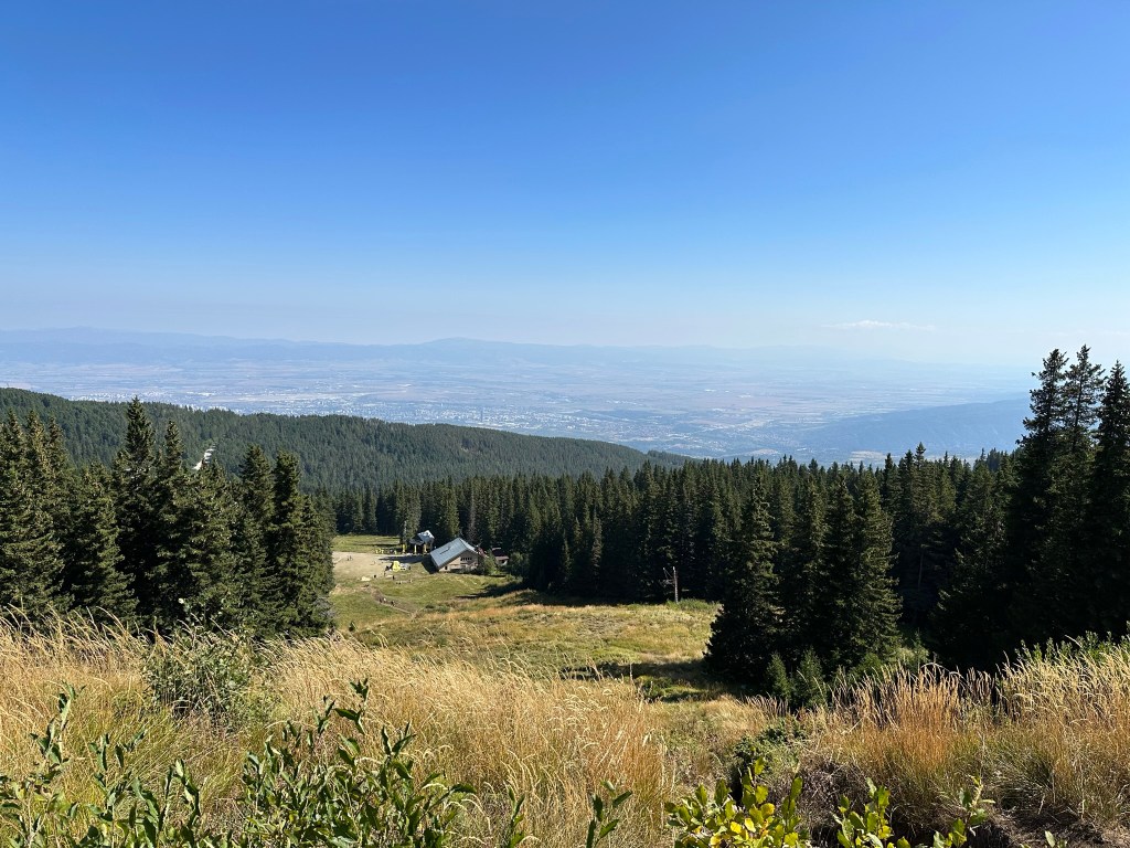 To walk to the summit, look for the fountain on the south side of Aleko hut. To the left of this fountain, there is a path that climbs the mountain. This is the path you want. It skirts the disused chair lift on your left, with Malak Rezen peak also on your left. You have a choice of choosing a more direct route, or zigzagging slightly (following the red markers), which makes the ascent easier. From Aleko hut to where the path joins the slip road from Goli Vrah is an elevation gain of 260 metres and takes approximately forty minutes. The views back to Sofia, of Malak Rezen peak to the south, Ushite and the peat reserve to the north (see the walk Ushite), are wonderful and well worth the effort.