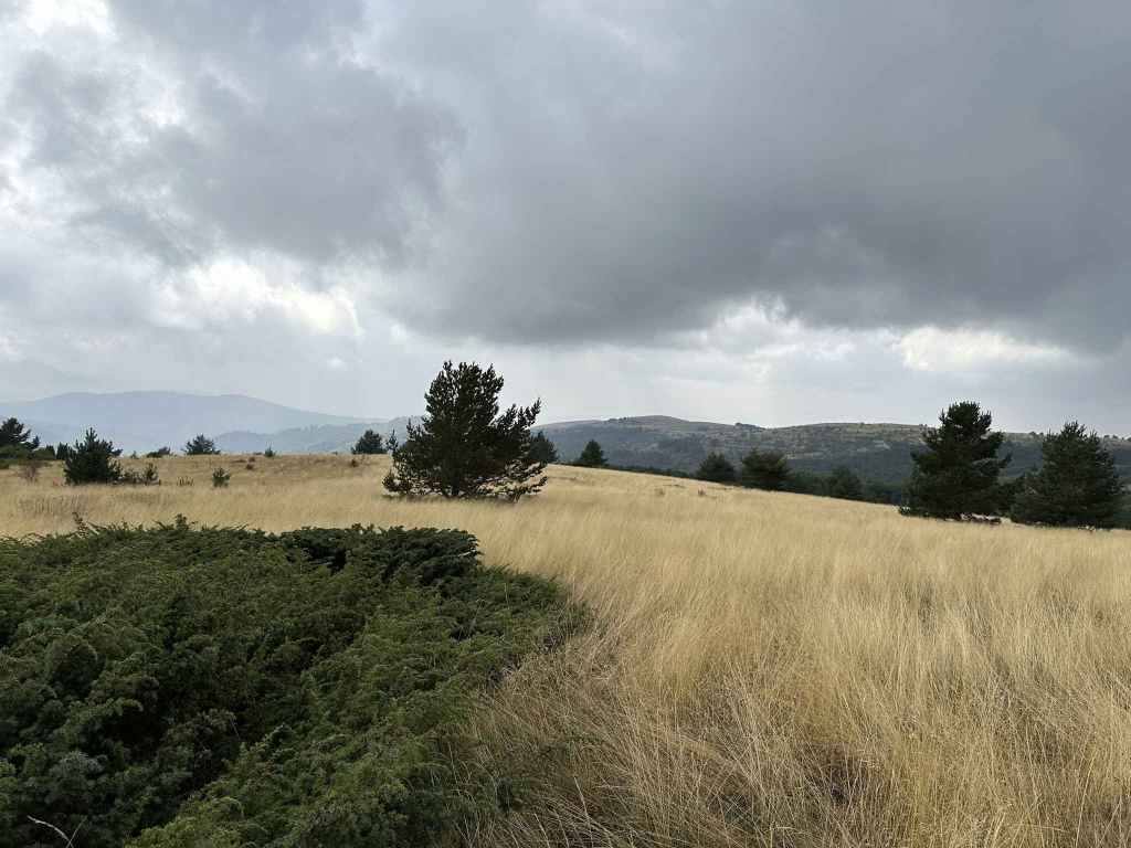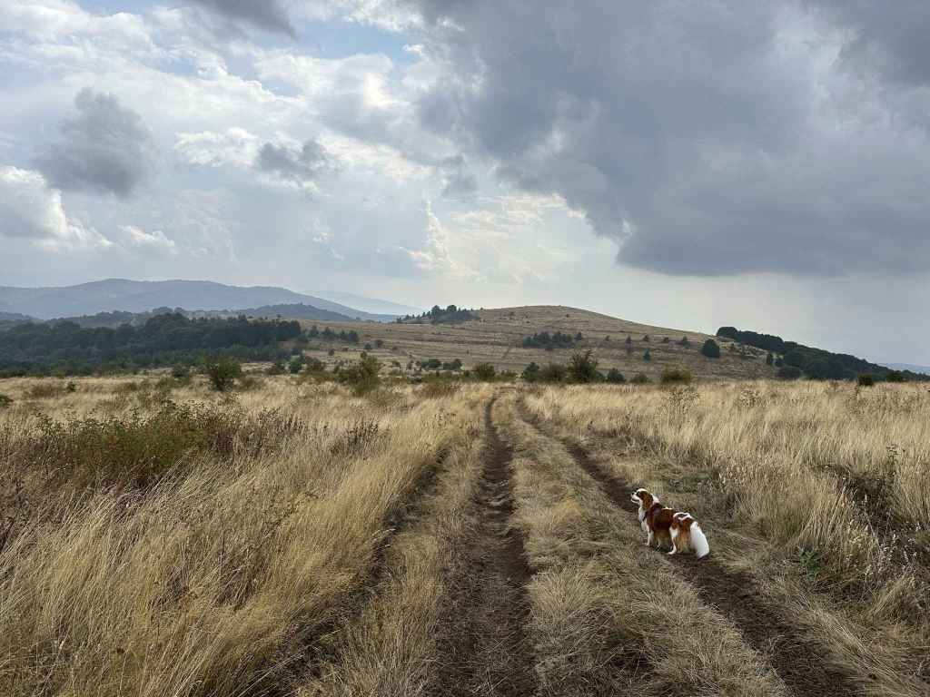 Having taken your rest, cross the bridge. The path continues on your left and then heads north as it climbs. After twenty minutes of walking through forest, you come out onto an open area of tall grass with fantastic views towards the summit on your right and a succession of lower hills on your left. After ten minutes, a path joins from the right and then leaves on the left. You can ignore it. After another five minutes, the path you are on divides (there is a sign “Chuypetlovo Village Horse ride” pointing back the way you came). You must be careful here because if you go right (north-west), you will end up in the village of Kladnitsa. Go left (south-west).