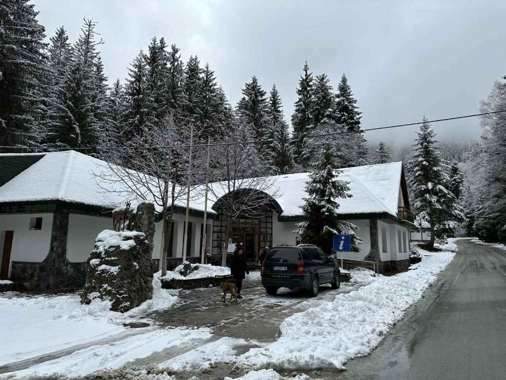 After 850 metres, you reach the rest house at Zeleni Preslap. Keep the rest house on your right and take the path that heads due south, to the left of some information boards. Continue on this path, with trees on either side, for 1.5 kilometres, then take the path on the right, signposted for Skakavitsa Hut and Kabul Peak. This path climbs gently at first, then more steeply. After two kilometres, a path on the right diverges to Kabul Peak. Keep left, and in 150 metres you will reach Skakavitsa Hut. The hut is open for refreshments in the summer, but not in March, when the ground is covered in thick snow and the only creatures we came across were a crestfallen guard dog and a large, standing wooden bear. The path to the waterfall is another 1.5 kilometres further south and takes about 40 minutes (in the snow). There are wonderful views of the waterfall and surrounding cliff faces as you approach.