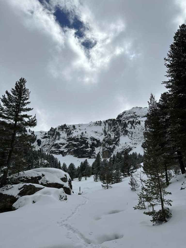 The walk is 11.5 kilometres, there and back, and in the snow in March it took us five hours. Factoring in the driving, that meant a day trip from Sofia of nine hours. The elevation gain is 475 metres, and there is quite a steep climb between Zeleni Preslap and Skakavitsa Hut, as you go through the forest, but the waterfall is eerily magical and well worth the effort. Just the fact you are a short distance from the Seven Rila Lakes is enthralling.