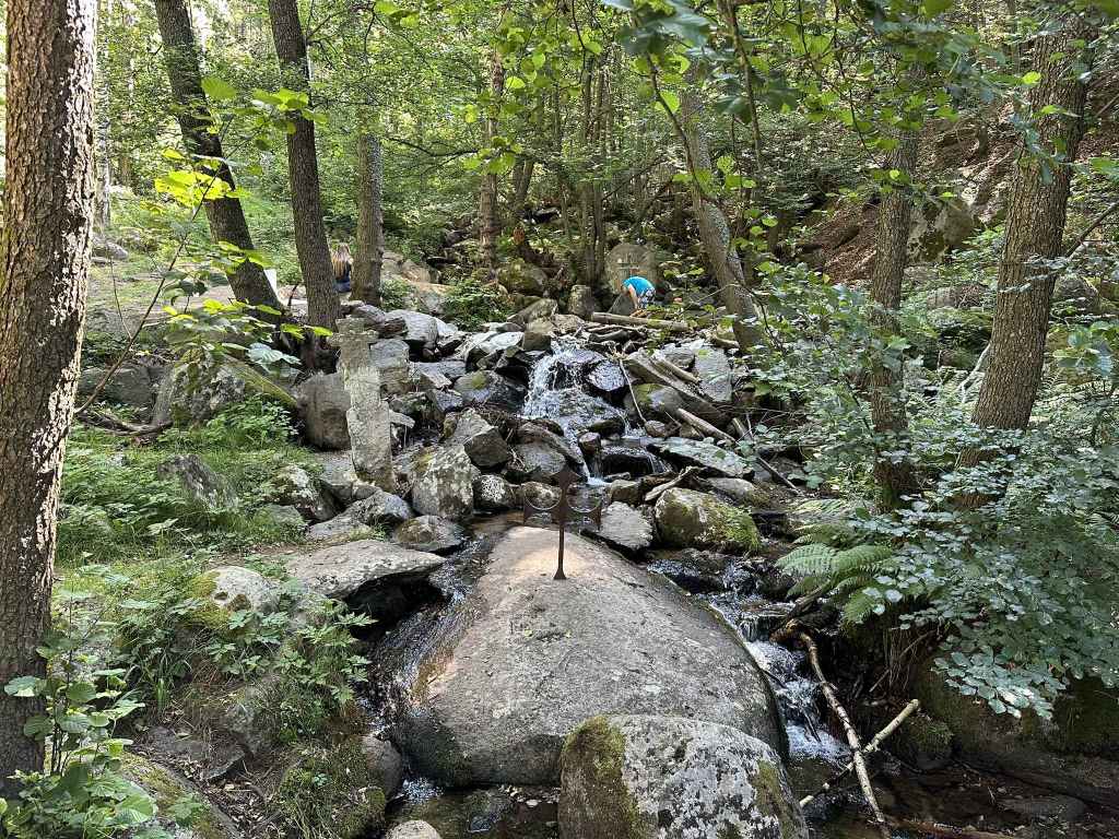 Very soon on the left is a picnic hut, with a small fountain behind it (only trickling water). Fifteen minutes after the picnic hut, there is a stone run, one of those moraine rivers that are so characteristic of Vitosha (and of the Falklands, apparently). Another 200 metres, and there is a wonderful view to the south-west of Studena Reservoir. Another ten minutes, and there is another small fountain on the right, this one without any water. One more kilometre, and you reach the top, with Ostritsa Hut on your right. You are now not far from the walk that begins at Ofeliite.