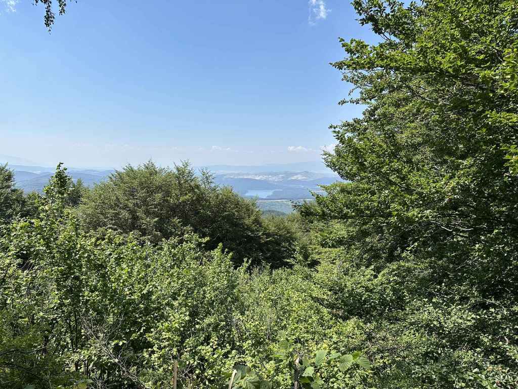The path heads behind the hut (where the kitchens are) and joins a track. At the track, turn left and continue climbing past some wonderfully located houses. 300 metres after the hut, the track veers right and enters the forest. This track will now take you to Ostritsa Hut, the highest point on this walk.