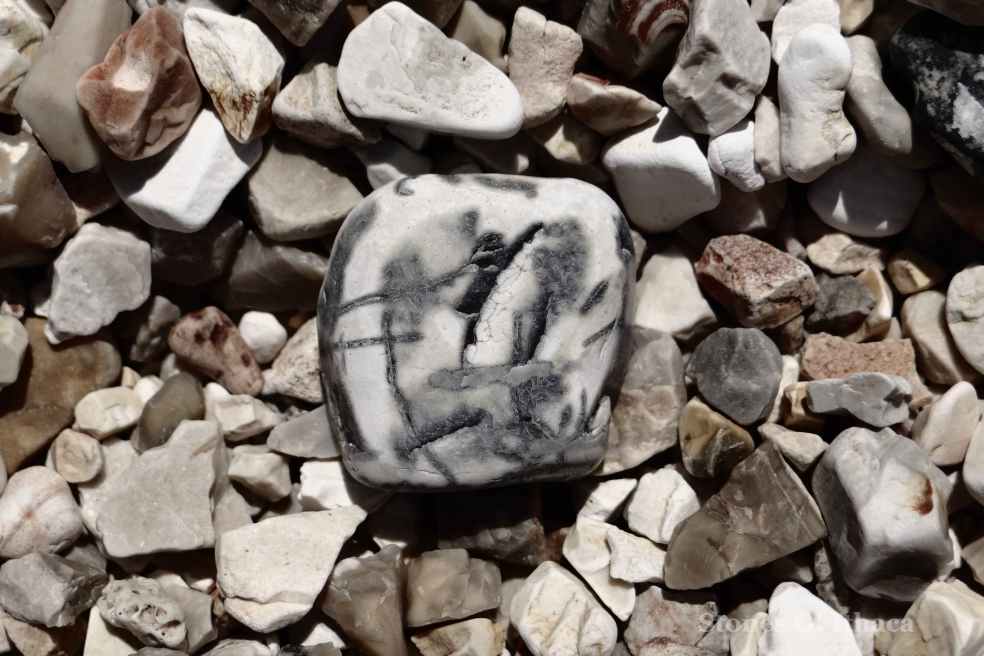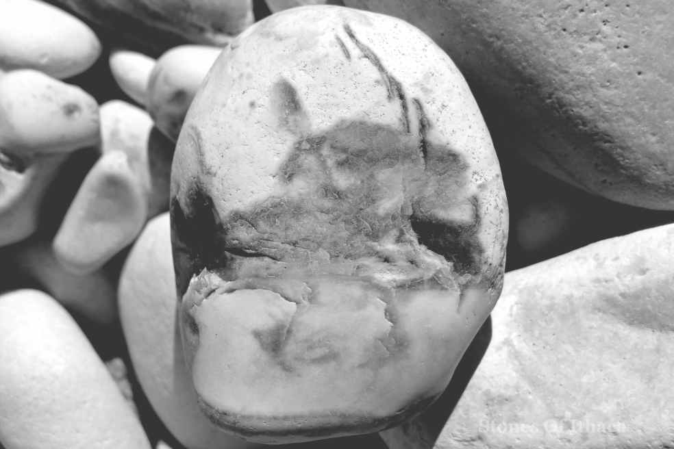 This is one of the most precious stones I have found on the beaches of Ithaca. It seemingly depicts a small girl reaching up to place something on or to retrieve something from a shelf. What secret is this? Perhaps something insignificant, but for her it has great value. We enter into her world, where the values are different – something adults often fail to do, imparting knowledge to children they find superfluous. And yet there is more to this stone than that. On the left and right are strange figures. At the bottom right, one figure seems to be sinking into the ground, or rising from it. And there is an elongated cross with its roots in the ground, maintaining the balance, spilling drops of blood on the old man below. Up above, along the top, a question mark. And the whole is looking at us, like the front of a train.