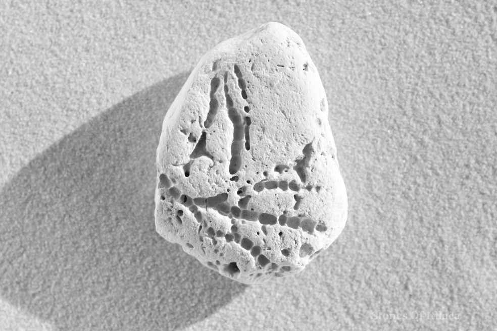 This stone is tectonic. One can almost see the plates of the Earth being crushed together. And the deep vein of the Mariana Trench reaching upwards. Of course, the plates – faces of passengers on the London Underground being squashed together – can also represent the waves of the sea, on which there is a boat, a yacht, whose mast is the Mariana Trench and whose sail is a letter, A. This ship is held down to the ocean floor by the trench, a kind of umbilical cord. It may strike us as flimsy, kindling waiting to be splintered and thrown on to the fire, or fragile, like a matchbox. And yet it is held down, connected. It will travel to and fro across the surface of the ocean, and mirror the ocean floor.