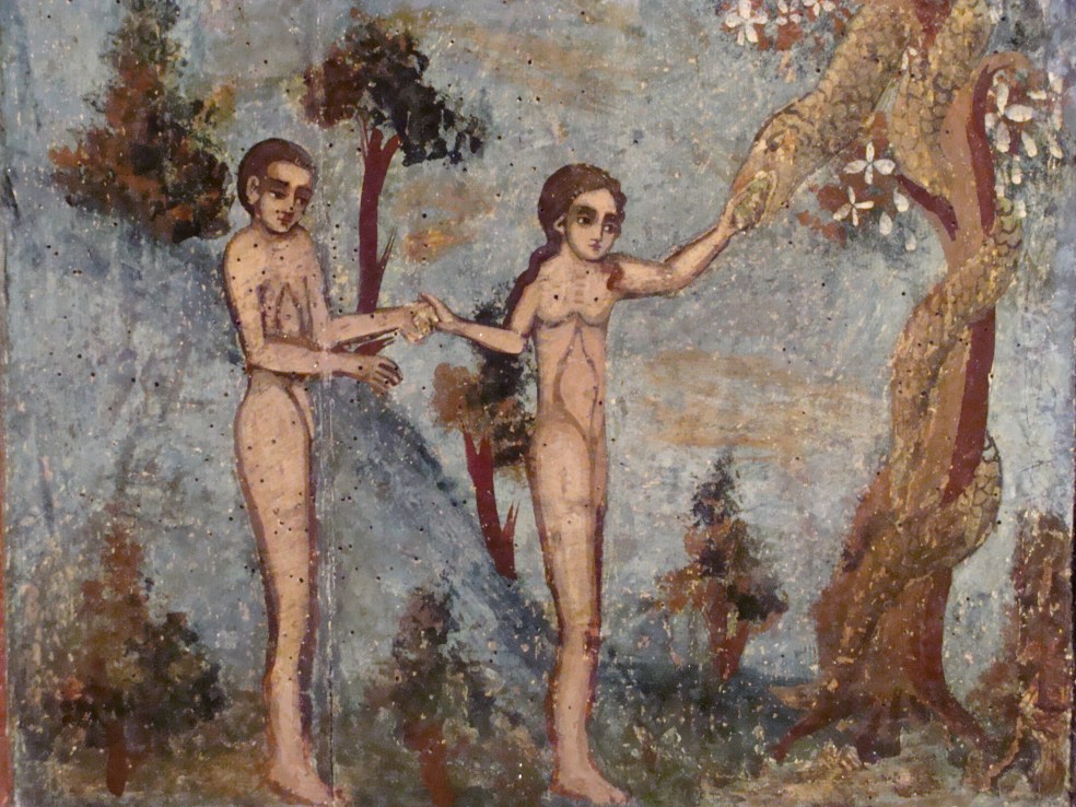 The story of the Fall of humankind is related in chapter 3 of the Book of Genesis. It is generally understood to mean that the woman, Eve, was tempted by the serpent and persuaded Adam to eat of the fruit of the tree of the knowledge of good and evil, which the Lord God had told the man not to eat from or else he would die. The serpent – a representation of evil, or the devil himself – tells Eve that they will not die, but their eyes will be opened and they will be like God, knowing good and evil. The man and the woman eat and then become aware of their nakedness, which causes them to hide when God comes visiting ‘at the time of the evening breeze’. The Lord God asks Adam how it is he knows that he is naked, and he replies that the woman gave him fruit from the tree to eat; she in turn blames the serpent. God pronounces their punishment, and the man and the woman are expelled from the Garden of Eden.