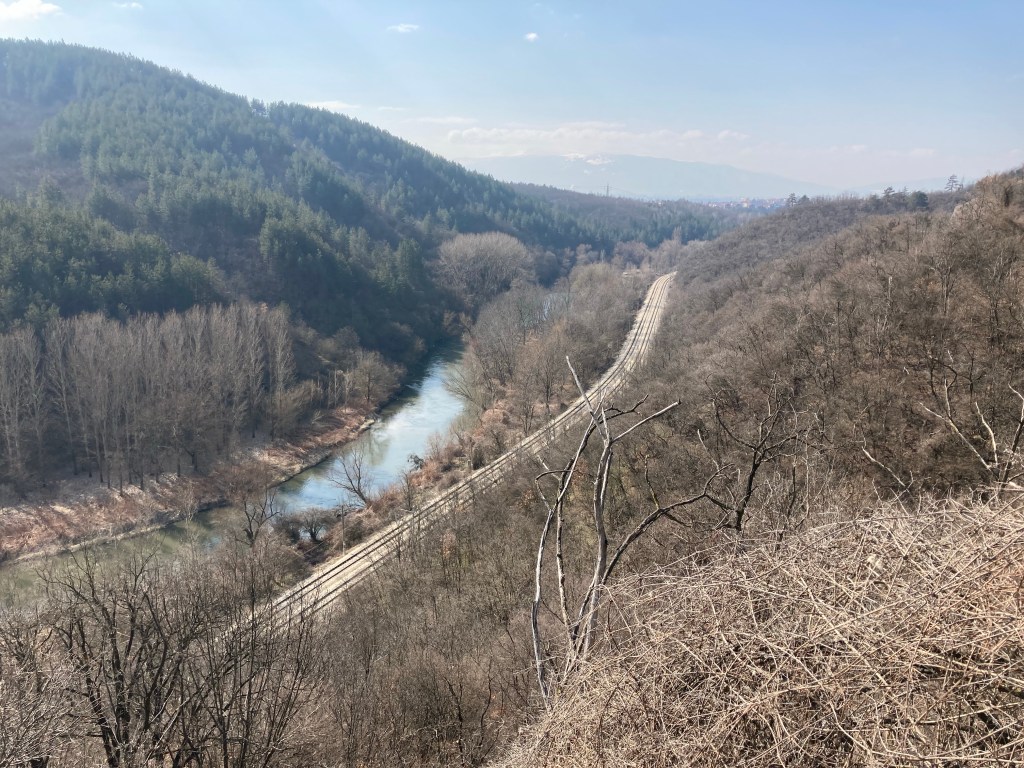 The Iskar Gorge with the railway running alongside it (in the background is Vitosha, the mountain south of Sofia).