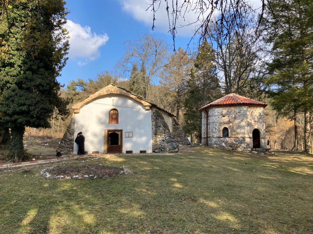 In 370 metres, there is another fountain next to a ruined house. The path now enters a field and then continues on the right. As it descends, you will have views of Tserovo (the village before Bov) on the left. Keep descending through the forest. The path zigzags, left-right-left, and in 800 metres reaches a larger picnic area with a small chapel. This is a good place to rest. From here, the path continues left. In 750 metres, it joins a larger track by the River Treskavetz. Go right here, and in one kilometre you will be back at the stadium. The whole route is 7.6 kilometres and took me 3½ hours with ample breaks.