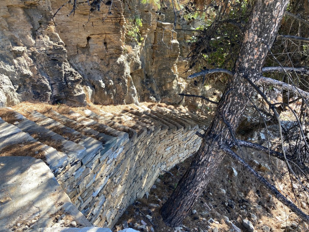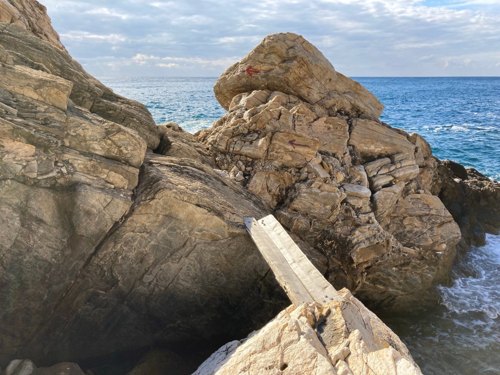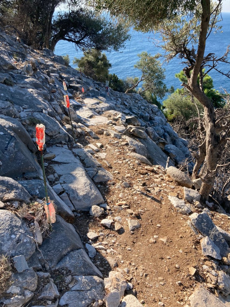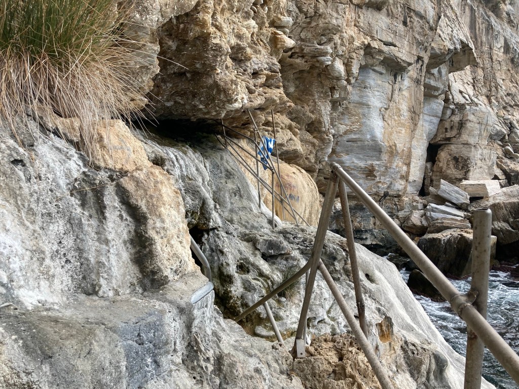 View of the Aegean from below the Monastery, with Athos in the distance.The path with metal poles topped by red-painted bottles.The pebble beach where the path meets the sea.Steps built going down to the beach (thank God for the workers!).A goat watches our progress.A rock archway you must pass through.A wooden bridge over a gap in the rocks.Golgotha, a climb up the rocks.