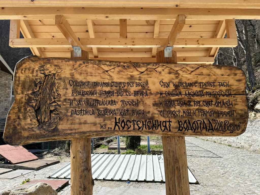 The wooden sign in front of Kostenets Waterfall, with a fragment of the poem ‘Kostenets Waterfall’ by Ivan Vazov.