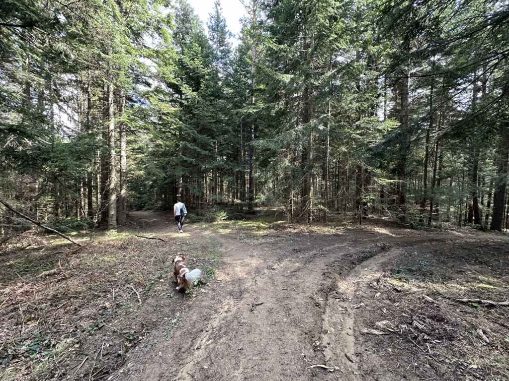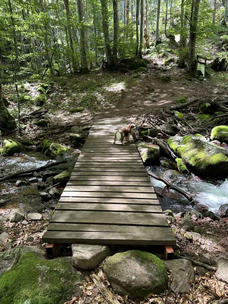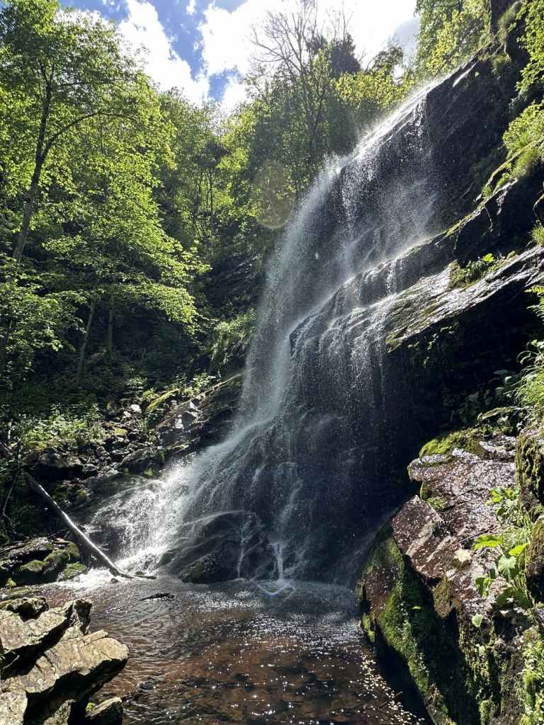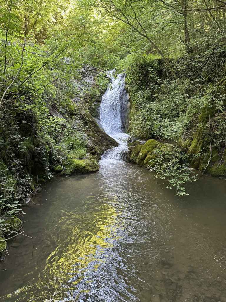 You should now have the river on your left. Walk upstream. In 200 m, a bridge of planks crosses a small tributary. Keep following the course of the other river. The path gets steeper, and at one point comes out into the open (I noticed a lot of fallen trees in May). So long as you keep the river on your left, you will not get lost. In another 300 m, there is a second plank bridge, this time over the river, taking you back to the east side. Now the river is on your right. Another 400 m, and there is a third plank bridge taking you back over to the west side, but by now the waterfall is visible through the trees. I sat with my dog for an hour and a half, and I can say the time just disappeared as I marvelled at the drops of spray, the rocks that make up the waterfall (a waterfall is water and rock), little flowers gleaming in the sunlight in far, out-of-the-way places that I could never reach. It was wonderful.