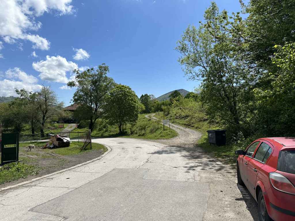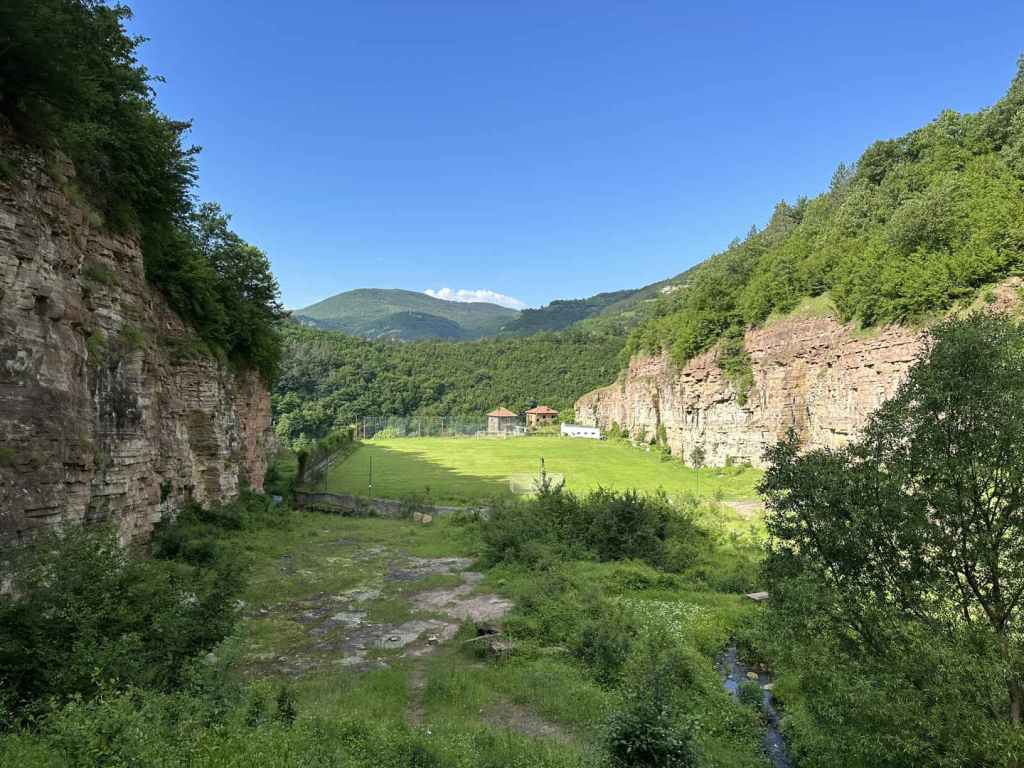 Having entered Etropole, continue on this road for 2 kilometres, where there is a sharp turning on the left, signposted for Etropole Monastery, Yamna and Teteven. Turn left here. The road takes you back on yourself. In 3 kilometres, you reach the village of Ribaritsa, which is where Etropole Monastery is situated. This was an important monastery during Ottoman times, an important scriptorium – many manuscripts were copied here. For now, keep going to Yamna, which is another 5 kilometres. 500 metres after you enter the village of Yamna, the road turns sharply left, and a dirt track diverges from the road on the right. This is the walk to the waterfall. There is a convenient verge just before the dirt track where you can park.