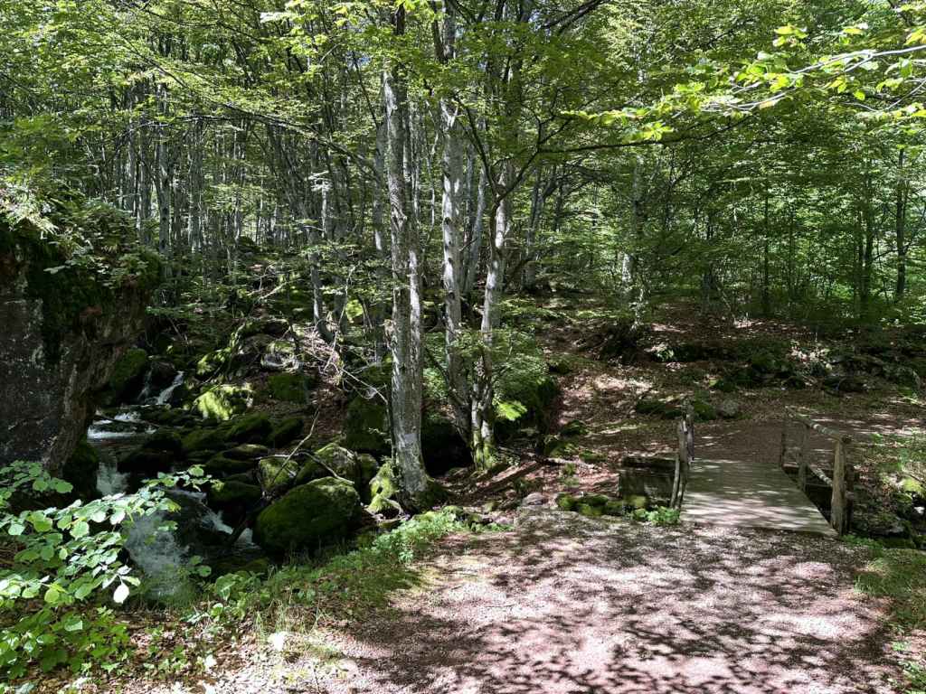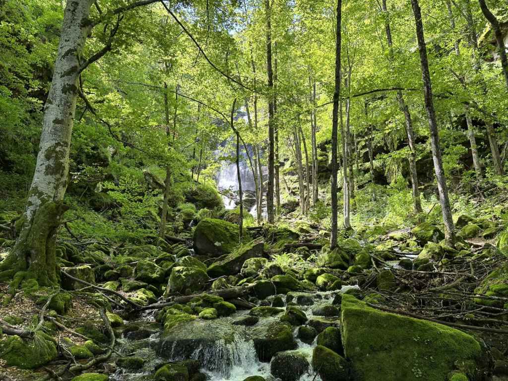 This track that has offered so much finally ends after five kilometres, and you enter the Severen Dzhendem Reserve, where there are beech forests protected by UNESCO. It now becomes a path. You have one more kilometre to go (twenty minutes). You will cross four wooden bridges. Then you will come to a fifth, higher wooden bridge, and suddenly notice the peaks of the mountain up ahead. It’s a startling view. Cross this bridge, and you will come to a small area with wooden benches, where you can sit, rest and admire the waterfall in the distance. It’s incredibly picturesque.