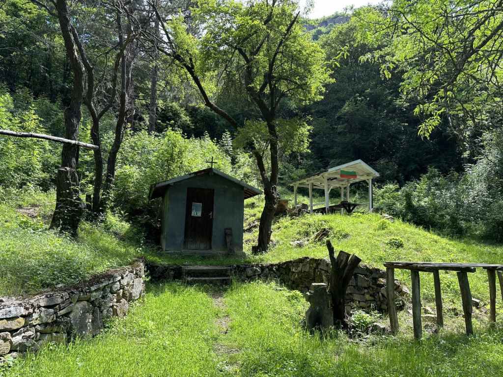 In 370 metres, there is another fountain next to a ruined house. The path now enters a field and then continues on the right. As it descends, you will have views of Tserovo (the village before Bov) on the left. Keep descending through the forest. The path zigzags, left-right-left, and in 800 metres reaches a larger picnic area with a small chapel. This is a good place to rest. From here, the path continues left. In 750 metres, it joins a larger track by the River Treskavetz. Go right here, and in one kilometre you will be back at the stadium. The whole route is 7.6 kilometres and took me 3½ hours with ample breaks.